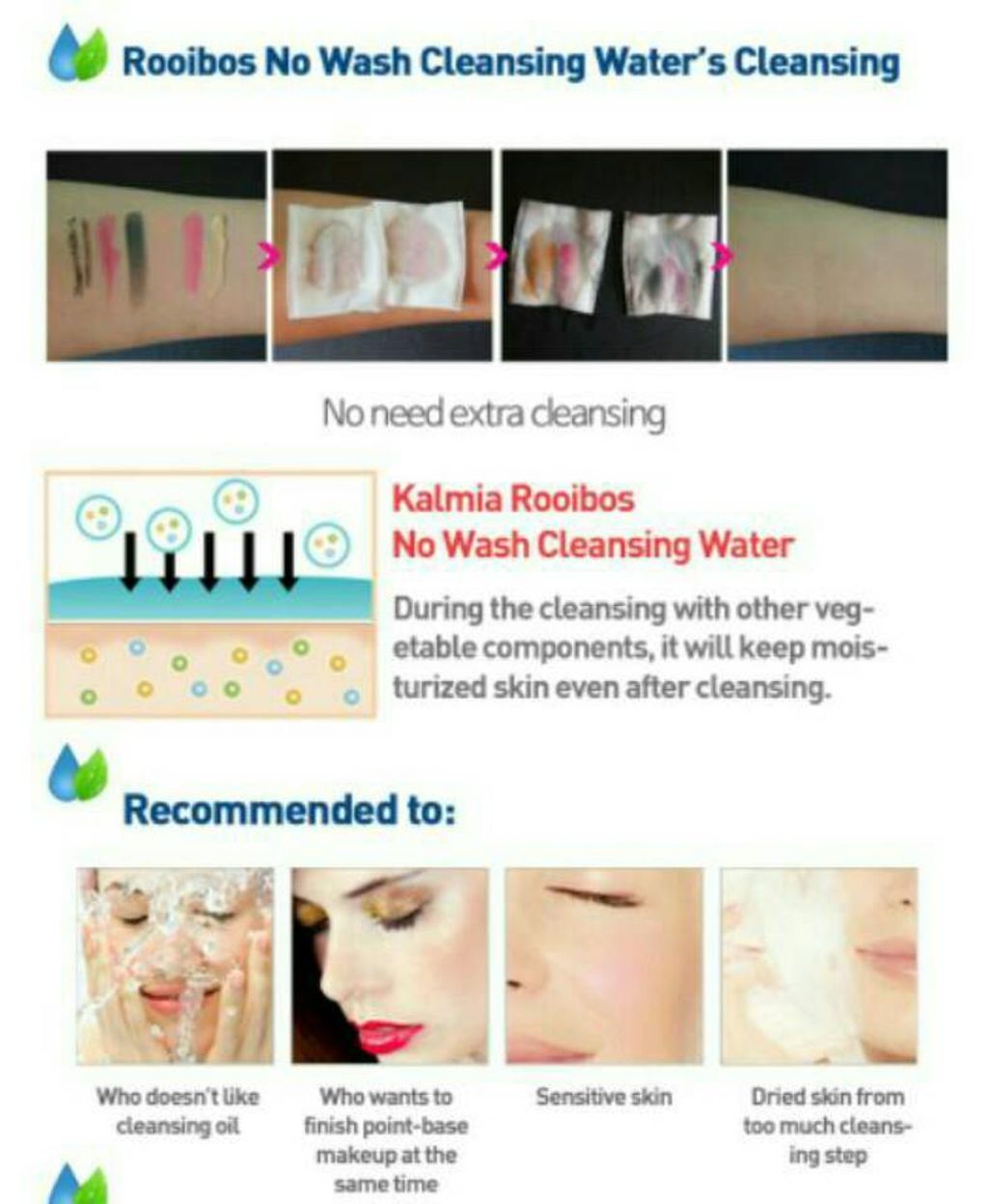 Provide perfect cleansing white excellent moisturizing Aspalathus Linearis extract Carbonated water 300mlCALMIA rooibos no wash cleansing water is provied perfect cleansing and with excellent moisturizing ability gives into the skin without dryness.