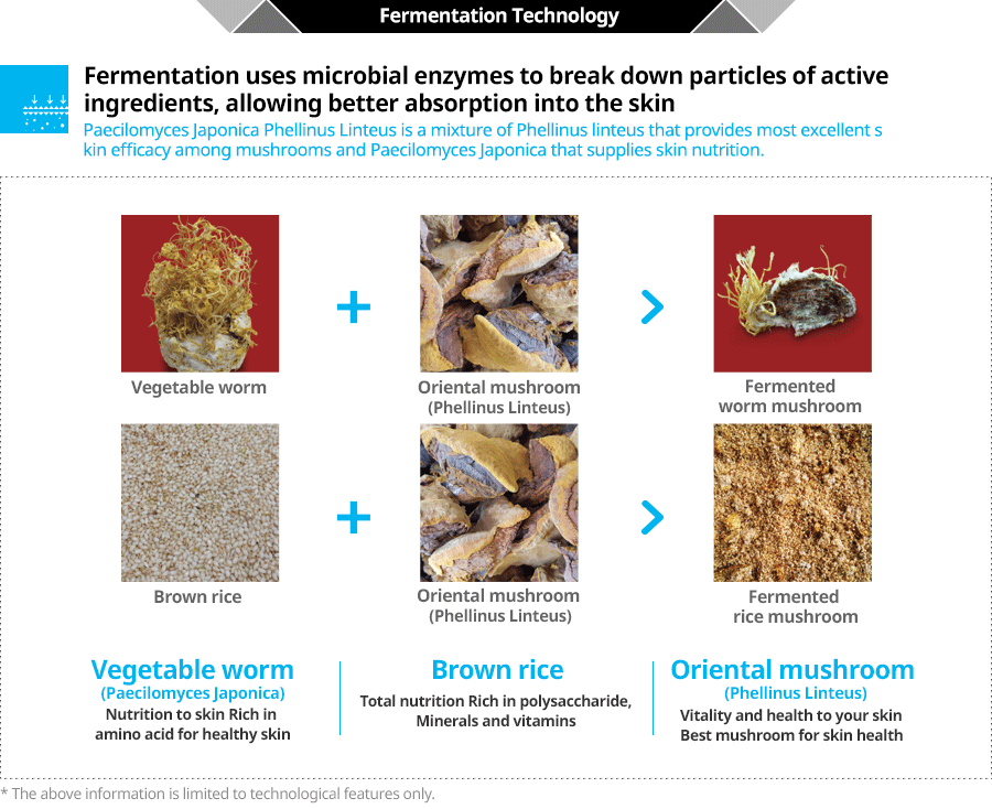 Enriched amino acids of vegetable worms (冬蟲夏草) and poly-saccharides, a skin protection ingredient of Phellinus linteus(桑黃), enhance skin firming effect.