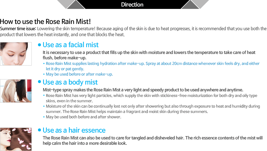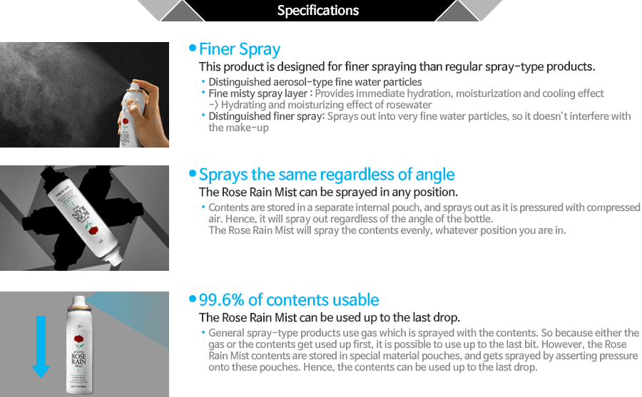 - General spray-type products use gas which is sprayed with the contents. So because either the gas or the contents get used up first, it is possible to use up to the last bit. However, the Rose Rain Mist contents are stored in special material pouches, and gets sprayed by asserting pressure onto these pouches. Hence, the contents can be used up to the last drop.