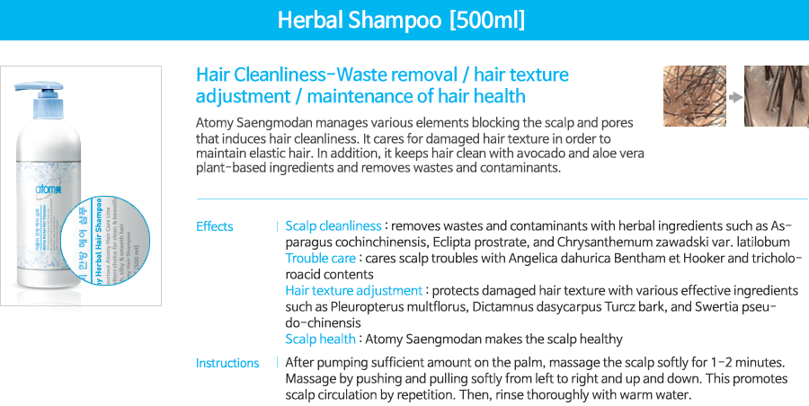 Hair care: cares split-ends and supplies nourishment with herbal ingredients of Atomy Saengmodan to maintain smooth and elastic hair