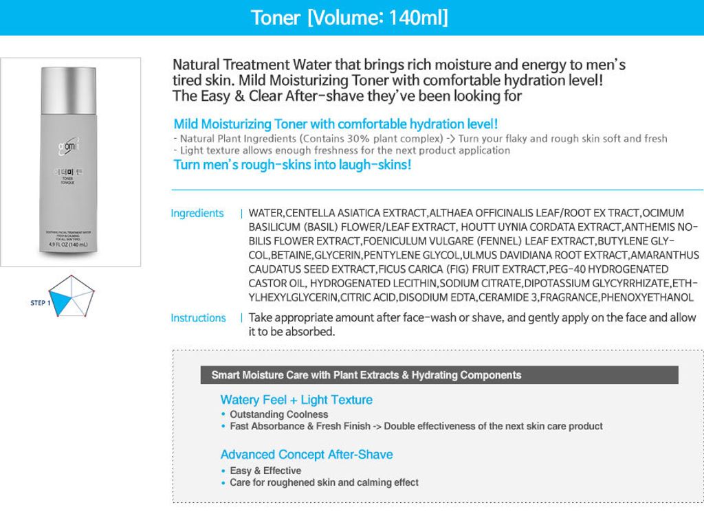 Toner 140ml Natural Treatment Water that brings rich moisture and energy to men’s tired skin. Mild Moisturizing Toner with comfortable hydration level! The Easy & Clear After-shave they’ve been looking for.