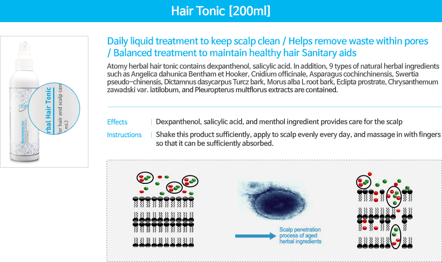Atomy Herbal Hair Tonic(200ml) contains dexpanthenol, salicylic acid, and menthol to prevent hair loss, make your hair thicker, and promote hair growth. It provides a cool refreshing feeling to your scalp.